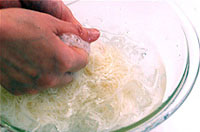 - ②そうめんをゆで、流水でもみ洗いする(写真)。水けをきって器に入れ、①を盛る。