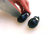 - ③なすはガクを少し切り、縦に細かく切れ目を入れておく(写真)。しし唐辛子は1カ所切れ目を入れる。なす、しし唐辛子を高温の油で揚げ、なすはねじって茶せんにする。