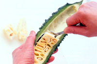- ①ピーマン、ゴーヤは縦半分に切ってわたと種を取る(写真)。アスパラガスは下の固い部分の皮むく。とうもろこしは半分の長さに切る。