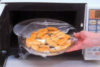 - ①かぼちゃは一口大に切り皮をむく。耐熱皿に重ならないように並べ、ラップをふんわりかけてレンジでやわらかくなるまで加熱し(写真)、熱いうちに裏ごす。