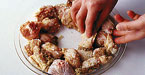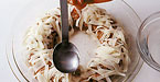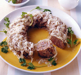- ②ボウルにひき肉を入れ、粘りが出るまでよく練り混ぜる。ここにAと①を加え、全体がなめらかになるまで混ぜる。これを直径25cmの耐熱皿に移し、手で幅5cm、外径18cm、内径8cmのリング形に整える。