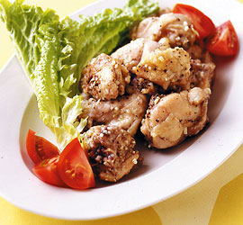 - ③鶏肉の上下を返して味をなじませ、器に盛り、グリーンリーフと食べやすく切ったトマトを添える。