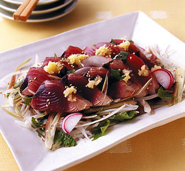 - ④かつおを8mm厚さに切って野菜の上に盛り、青じそをちぎって散らす。しょうがとにんにくものせ、いりごまをふってしょうゆをかける。