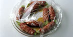 ラップは余裕をもたせてふんわりとかける。ぴっちりすると加熱後に中が真空になり、圧力で料理がつぶれたり、やけどをすることがあるので注意。