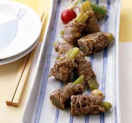 - ②牛肉は1枚ずつ広げてふきをのせ、手前からくるくる巻く。全体に小麦粉をまぶし、巻き終わりを下にして直径25cmの耐熱皿の周囲に並べる。Aを混ぜて全体に回しかけ、ラップをふんわりとかけて、電子レンジで6分加熱する。