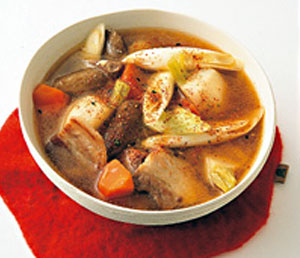- ①豚肉は1cm幅に切り、全体に塩、粗びき黒こしょうをふる。ごぼうとにんじんは一口大の乱切りにし、かぶは茎を3cmほど残して皮をむき、縦4等分に切る。長ねぎは斜め1cm幅に切る。