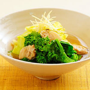 - ③②にキャベツ、菜の花、しょうがの2/3量を加えてひと煮立ちさせ、はまぐりの身を殻から出して戻し入れ、サッと火を通す。器に盛り、水けをよくきったしょうがを飾る。