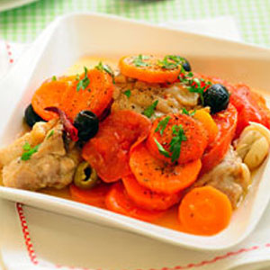 - ③②ににんじん、トマト、赤唐辛子を加え、ふたをして弱火で10~12分蒸し煮にし、塩、粗びき黒こしょう、オリーブの塩漬けを加えて味をととのえる。器に盛り、粗く刻んだイタリアンパセリを散らす。