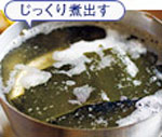 - ③30分たったら昆布だしが出ているか味見をし、強火にして温度を上げ、気泡が立ってきたら昆布を取り出す(85度)。