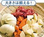 - ①じゃがいもは皮をむき、食べやすい大きさに切って水にさらす。にんじんは皮をむかずに乱切り、玉ねぎは串切りにする。野菜の大きさは揃えるのがコツ。