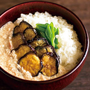 - ④③の鶏そおぼろあんの火を止め、練りごまを2~3回に分けて混ぜながら加える。練りごまが混ざったら、①で揚げたなすを入れ再び火をつけ、ひと煮立ちさせる。
