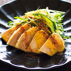 - ①鶏肉は塩をふり、30分ほど置いてうまみを凝縮させ、酒をかけて蒸し上げ、冷ましておく。