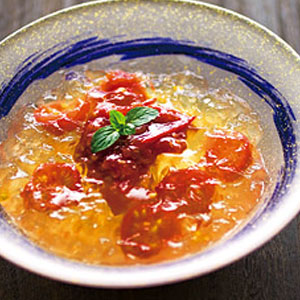 ゼリーのトマトは縦より横に切ったほうがかわいい!砂糖は焦げやすいので、白ワインによく溶かしてから火にかける。ジャムはしっかり煮つめて。パンやアイスにもオススメ!