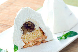 - クッキーの上に半分に切ったカステラをのせ、その上にチーズディップ25gを丸めてのせます。ホイップクリームをへらやナイフなどで、山のように塗りつけていきます。最後に、上から表面をなでるように形を整え、仕上げに粉砂糖を茶漉しなどを使いふりかけ、ミントを飾ります。