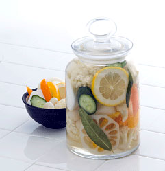 - ④冷めたところで、ラッキョウ漬けとレモンの輪切りを加え、塩加減を調整します。