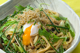 - フライパンにゴマ油をひき、ひとくち大に切り分けたシメジ、キャベツを炒めます。うどんを加えよく炒め、醤油を回しかけ、味を調えます。3センチ程度に切り分けた水菜と万能ネギをあえるように軽く炒め、皿に盛り付けます。じゃこと温泉卵をのせてできあがりです。