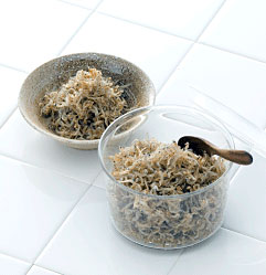 - ①フライパンにゴマ油をひき、じゃこを炒めます。