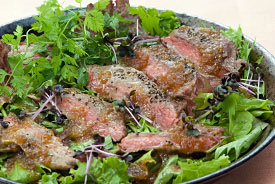 - ステーキ用牛肉に塩コショウをして、フライパンでお好みの火加減で焼き上げる。皿に、ひとくち大に切り分け混ぜ合わせたサラダを盛り付け、スライスしたステーキをサラダにのせます。ソースを回しかけ、レッドキャベツスプラウトとセルフィーユを飾ります。