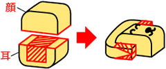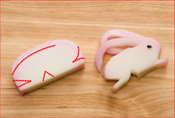7mm程度に薄切りにしたかまぼこに写真のように切り込みを入れ、耳を巻きこみ形を調えます。目の位置に胡麻を差し込みます。