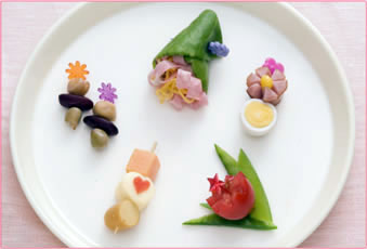 切り分けた野菜をさまざまな花の型で抜き、煮物にします。