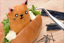 ロールパンに切り込みを入れて、レタス、フライ、タルタルソースをはさみ込みます。ソーセージを耳に見立てて切り、細く切った昆布を使い、頭の部分に差し込みます。海苔とチーズを切り抜き表情をつくります。昆布のひげをつけます。