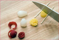 小梅はリンゴの皮をむくように包丁を入れ、切り分けたものをバラに見立てて巻きます。ラッキョウは縦に細く切り込みを入れ、スイレンのように開きます。たくあんは楊枝などをあて、下部の一部だけを残しタンポポに見立て格子状に切り込みを入れます。