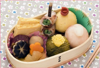 シンプルな定番メニューも、和風の型抜きを使ったり、ちょっとした包丁テクニックですてきにデコレーション。雰囲気のあるまげわっぱを使えば、より一層おしゃれなお弁当に仕上がります。