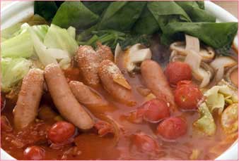 - ③水とコンソメの素を加えて煮立ったら、ウインナーとひと口大に切ったキャベツ、タマネギ、シイタケを入れて弱火で10分熱する。やわらかくなったらミニトマトを加えて、さらに10分程度煮込む。