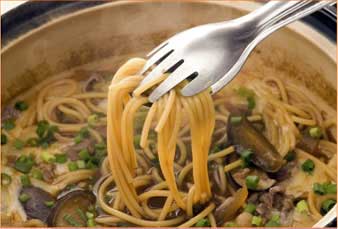 - ②火にかけてスープが煮立ったら、半分の長さに折った乾燥パスタを入れて中火で煮込む。