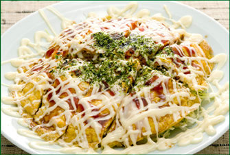 - ⑥中濃ソース、ケチャップ、マヨネーズを格子状にかけ、お好みで青のりをトッピングする。