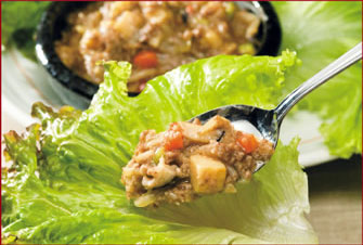 具材をサニーレタスで巻いていただく、駒八オリジナル・サラダ。こちらにご紹介している野菜に限らず、いろんな材料を加えてアレンジしてみてください。具材は冷凍保存することもできるので、一度に多めにつくっておくと便利です。