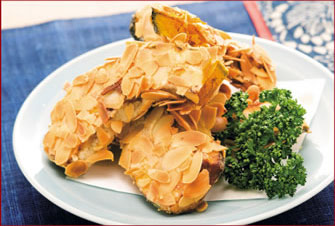 女性から人気を集めているカボチャのアーモンド揚げ。サックリ、ほっくりと揚がったカボチャは絶品です。お子さまのおやつにもピッタリのメニューになりそう。同じレシピでサツマイモを使ってもおいしくできます。