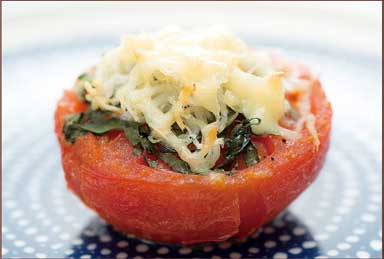 トマト×バジル×しらすで生まれる味のトリコロール。ピザ生地の代わりに、トマトに具をのせてオーブンへ。いつもの見慣れた食材も、それだけでゴージャスな装いに変身します。