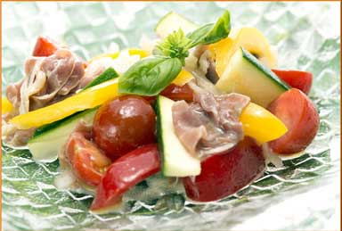 切って漬けるだけ!お酢で夏バテ解消。夏野菜と生ハムを切り、マリネ液に漬けるだけの簡単メニュー。さわやかなレモンとビネガーの香りが、夏の暑さでダウンした食欲を刺激します。