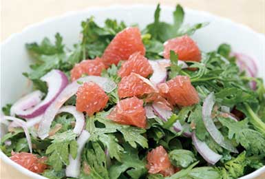 春を先取りしたような爽やかな味がうれしい一品。緑と赤の見た目も華やかなサラダ。春菊の葉とグレープフルーツをレモン入りドレッシングであえれば完成。ほどよい酸味とほのかな甘みの優しい味です。あれば紫タマネギも加えると、彩りがより美しくなります。