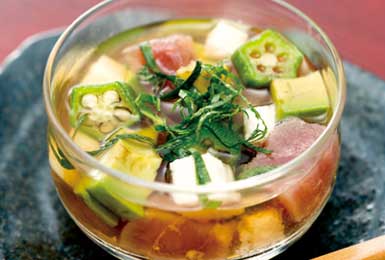 - ⑤①と②を彩りよく器に入れて、冷ました④を注ぐ。