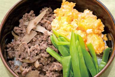 甘辛く煮た牛ひき肉とゴボウがしみじみおいしい!ご飯の上に醤油をまぶしたかつお節を広げてから三色の具材を盛りつけるのが、ポイントです。細切りにしたキヌサヤのシャキシャキ感も影の主役になります。