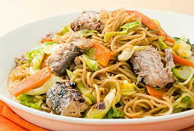 - うま味のつまった缶汁でめんを戻してさらにおいしく。サバ缶焼きそば
