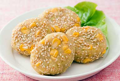 しっとりとしたサツマイモベースのタネにシャキシャキのコーンをたっぷり混ぜて、パン粉の変わりにゴマをまぶしたお手軽コロッケ。