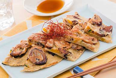 - ③フライパンにゴマ油を熱し、②を流し入れて弱めの中火で焼く。片面が焼けたら裏返し、フライ返しで軽く押さえながらもう片面も焼く。食べやすい大きさに切り、糸トウガラシをのせる。お好みで黒酢醤油をつけていただく。