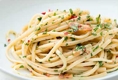 - ⑤ゆであがったパスタを加えてあえ、火を止めてレモンを搾り、粗ミジン切りにしたイタリアンパセリを加えてざっと混ぜる。