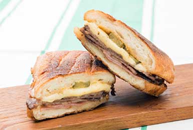 - ③①のフランスパンの片方を裏返し、ローストポーク、ロースハムの薄切り、スライスチーズ、ピクルスの順にのせる。もう片方のフランスパンの内側にフレンチマスタードを塗ってから、かぶせてサンドする。