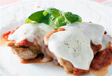 - ④温めたトマトソースをかけ、4枚にスライスしたモッツァレラチーズを、それぞれの鶏肉にのせる。ふたをして、チーズを溶かしながら鶏肉に完全に火を通す。皿に盛りつけてバジルをのせる。