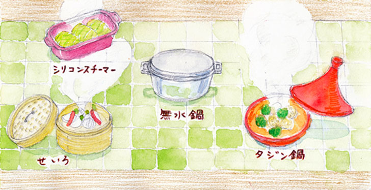 蒸し野菜は炒め物と比べて油を使わない分ヘルシーだし、蒸すことで甘味が増して、素材の味わいを最大限に楽しむことができます。蒸し器やせいろのほか、無水鍋やタジン鍋を使う人も。外からじっくり、じんわりと熱を伝えるため、中までしっかりと火が通ります。野菜に含まれる水分が失われることもなく、むしろ適度な水分が外から加わるため、べちゃっとした感じもぱさつきもありません。