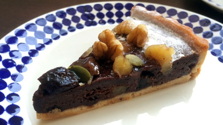 まずはショコラタルト。ビター&スイートなクーベルチュールをリッチに使ったチョコクリームは、しっとりとした生チョコのような口溶け。たっぷりのナッツとドライフルーツが味にも食感にもアクセントを与えています。