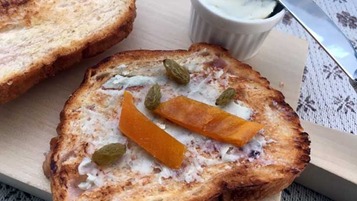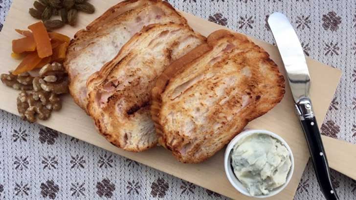 ゴルゴンゾーラを桃パンにぬり、好みでドライマンゴーやレーズンをのせてパクリッと。