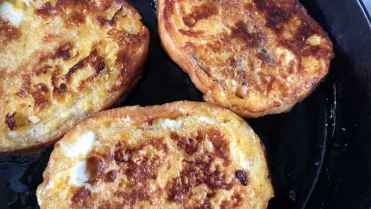 バターをたっぷり溶かしたフライパンに、卵液にひたしておいたメープルパンを入れ、ほどよい焼き色がつくまでしっかり焼き付けます。