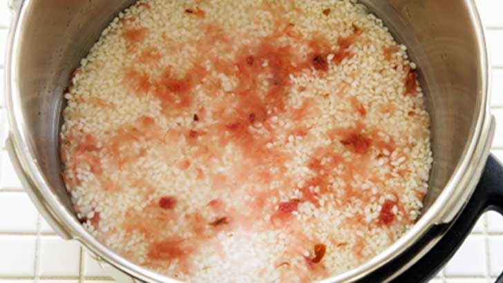 さぁ、ご飯を炊きましょう。先ほど手でちぎった桜の花びらを加えるとこんな感じ。ほんのりとピンクに染まり、かわいらしいですね。もっとピンク色を鮮やかにしたい人はここで食紅をほんの少々(耳かき1/4程度)加えても。少し塩気がほしいので、塩小さじ1程度を加えて炊きましょう。