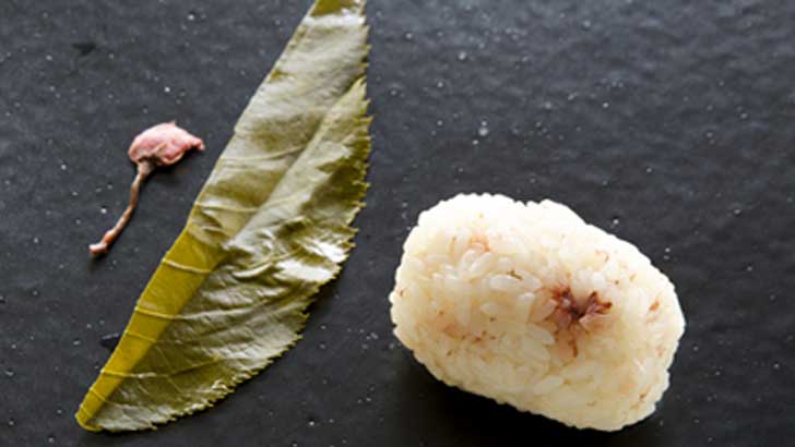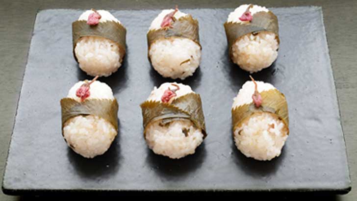 炊きあがったら少しさましてからおにぎりにします。葉っぱを巻き、飾り用に取ってあった桜花をのせれば、完成です。もち米を混ぜているので、もっちりとした食感が楽しめます。