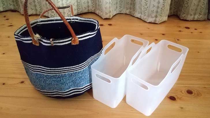 容れ物は大きなカゴでも箱でもOK。園や学校から帰宅したら、または持ち物を使い終わったら、それぞれの容れ物に取り敢えず分けて入れること。これだけでも、見える床面積がグッと広くなるはずです。